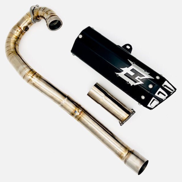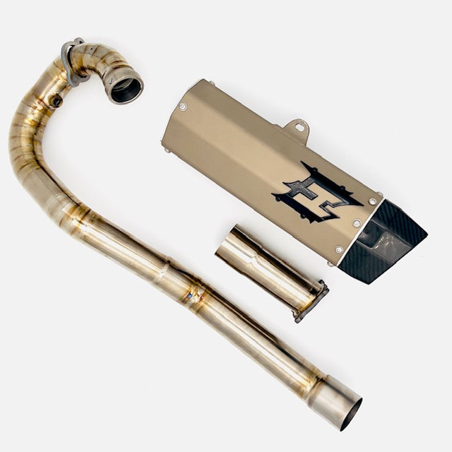 Empire Industries KTM 690 SMCR Titanium Exhaust System. The handcrafted Titanium Step Pipe sets itself apart from competitors with its lightweight titanium construction, which not only provides a distinct custom appearance but also enhances performance. The remarkable improvements in top-end performance are undeniable. Additionally, the integration of a 6061 Aluminum Silencer and billet end caps ensures that re-packing is a breeze.